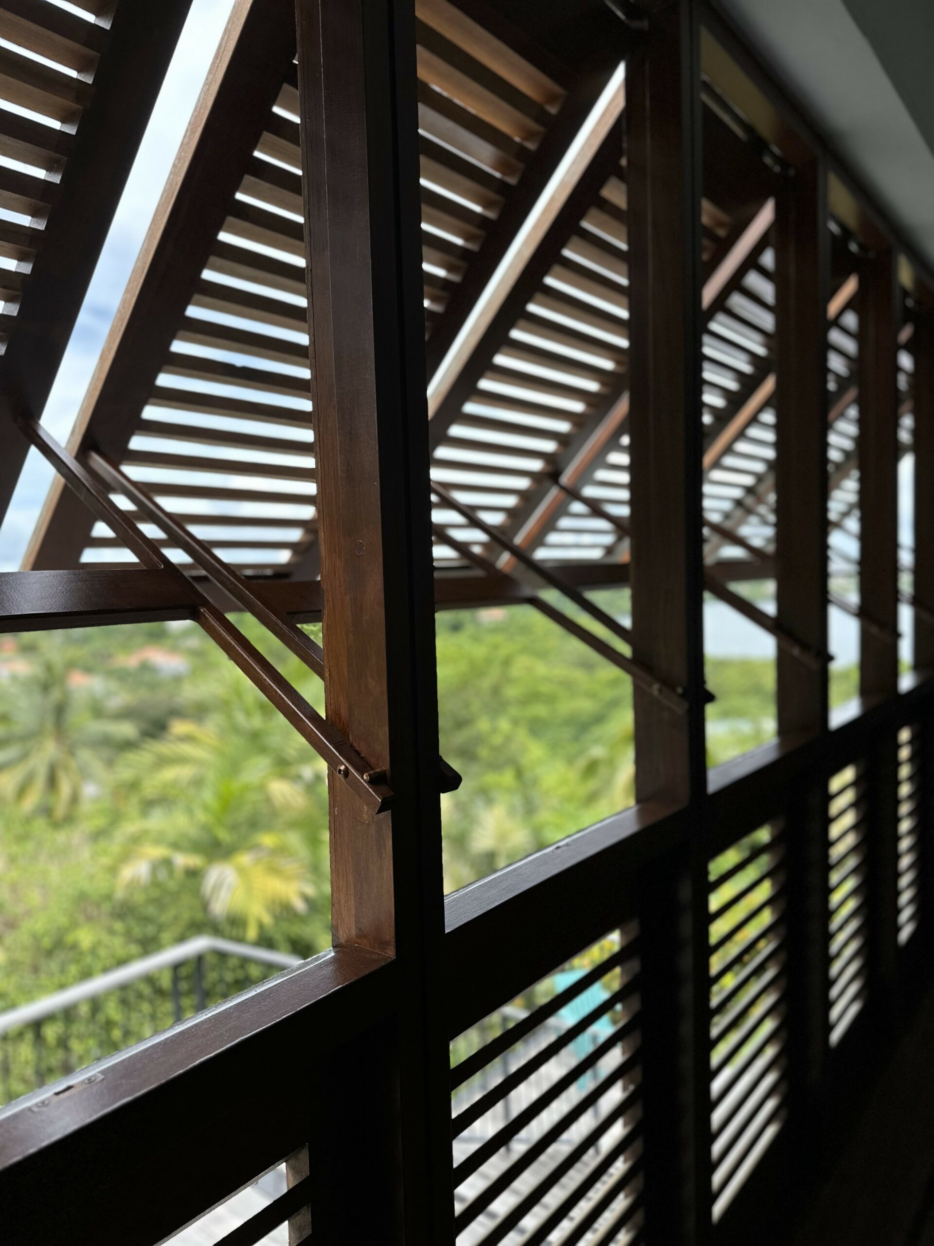 Le mobilier, entièrement réalisé en Cumaru par une entreprise martiniquaise, souligne l’engagement en faveur de l’économie locale.